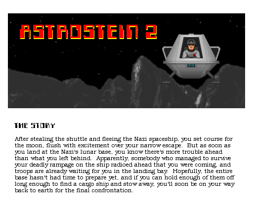 Astrostein 2 is a scenario for Wolfenstein 3D (3rd Encounter or full commercial version) featuring new sounds and graphics.