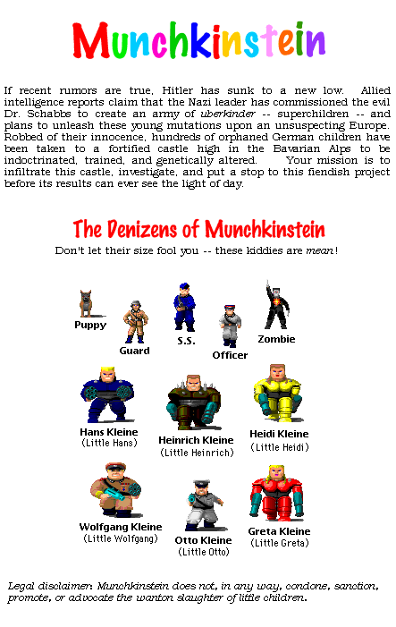 Munchkinstein Demo is a scenario for Wolfenstein 3D, and is compatible with both 2nd and 3rd Encounters. This version replaces the original demo, which had a bug that caused it to crash on some Macs.