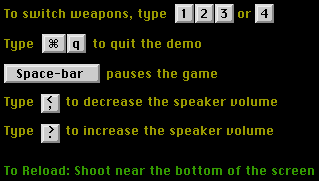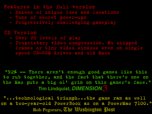 "a great simple shoot-em-up game...has the same primal appeal of Doom...addictive...the perfect game for five or ten minutes of gunplay anytime you're stressed out and need a violence fix." Wayne Bremser, Mac Home Journal