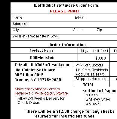 DOOMenstein Episode 1 contains the first four levels of a totally NEW Wolfenstein experience entitled: DOOMenstein. Experience all the DOOM II levels, DOOM wall textures, objects, and enemies with DOOMenstein for Wolf 3d. Plus, when you register DOOMenstein Episode 1, you'll receive a patch to import DOOM sounds into Wolfenstein, 'cause a barking DEMON just don't cut it! To experience DOOMenstein Episode 1, you'll need either Wolfenstein 2nd Encounter, 3rd Encounter, or Wolfenstein 3d Commercial and a Macintosh with a color monitor. Don't miss this TOTALLY NEW WOLFENSTEIN EXPERIENCE!
