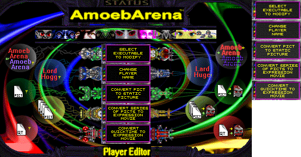 The brand new PlayerEditor for AmoebArena, a strategy game published by Casady & Greene. The PlayerEditor allows you to easily substitute your homemade graphics and animation sequences for those of the contestants in the game. Feel free to distribute your wacky creations anywhere and everywhere!