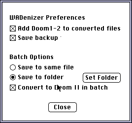 The WADenizer is a utility for converting Doom II WAD add-on files so they work better with MacDoom. Specifically, it expands sprites like the PC program DeUSF, fixes the demos so Doom will not crash, and allows map conversion from Doom to Doom II. It can also extract parts of the files, allowing you separate sound, map, and graphic portions. Version 2.0 of the WADenizer adds support for more WADs, such as the Army of Darkness conversion, and allows the copying of miscellaneous other WAD information previous versions ignored.