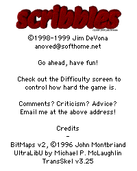 Scribbles requires a PPC (PowerPC) Macintosh and should be used with a monitor that can support at least 8-bit color. You really shouldn't have any problems meeting this requirements unless you have an older machine; if demand is high I could probably make a 68k version but until then I won't bother. - All other information is available in the included Readme -