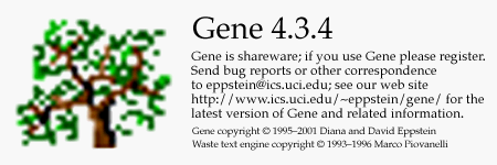 This is Gene 4.3.4, the shareware program for managing genealogy databases and drawing family trees. This release fixes some bugs in version 4.3.3 of Gene.