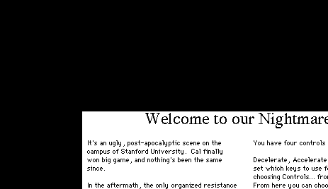 You are the driver of an armored vehicle patrolling the site of a post-apocalyptic west coast university (hint: Not Cal). Armed with a cannon and rocket launcher, you must defend yourself against mutant hordes and navigate a treacherous wasteland. Prepare yourself for eight grueling levels of giant, rabid, acorn-launching squirrels; angry, balloon-riding, axe-wielding Cal mascots; and the gaping ravines left by vicious earthquakes. Bring clean underwear.