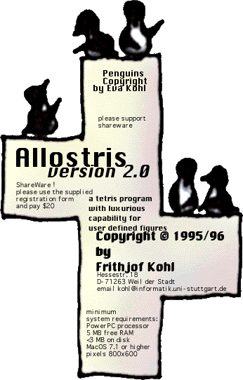 This is version 2 of the most powerful tetris variation I know! It supports: - user editable tetris figures, i.e. you can paint your own more or less crazy shaped things with which you want to play. NOT ONLY THE STANDARD TETRIS OR PENTRIS FIGURES ARE SUPPORTED ANYTHING FITTING IN A 6 BY 6 MATRIX IS ALLOWED - and you can design it - almost any field dimension from 6 by 6 to 100 by 200 or more - many powerful options and a nice designed interface. - requirements: PowerMac or compatible 5 MB free RAM, 4 MB on disk MacOS 7 or higher
