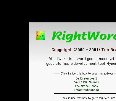 RightWord is a word game that resembles a popular game on Dutch television. There are PPC and 68K versions; with this you have the 68K version. It's meant for both adults and children. The fun of playing RightWord is to find the 5-letter words (in English) of which RightWord presents the first letter. You can either play alone or against an opponent, on the same machine or via an internal network. There's also a factor of luck that makes RightWord even more attractive, which has to do with 'drawing balls' and achieving the word 'RIGHT' as column, row or diagonal in a colored bingo board. Further, there are 'red balls' to change the course of the game. Version 1.0.4 fixes a startup problem when used with Mac OS 7.0 or 7.1.