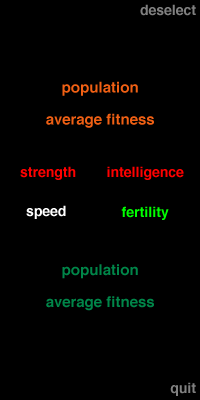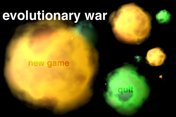 Evolutionary War is just like the classic game of chess... except for the fact that your pawns can asexually reproduce, thus generating slightly genetically altered copies of themselves. Players control a population of organisms, each of which has a unique genetic makeup that determines its strength, intelligence, fertility, and speed. These organisms can mate, clone, shift, and attack, and the result of all these actions depends highly upon the genetic structure of each organism. Whichever population evolves most quickly can achieve victory by eliminating all members of the enemy population. Play against the computer or a human opponent.