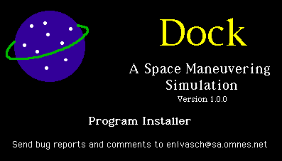 Dock is a simulation of an earth orbiting space shuttle and the MIR space station. Your objective is to dock the shuttle to the space station. In order to do that you must fly with the shuttle over the station. You maneuver the Shuttle by firing its thrust motors and by turning the direction in which the motors will fire.