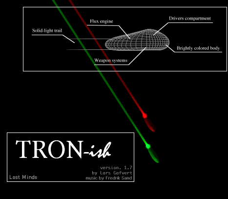 TRON-ish is as the name hints a TRON clone of sorts, if you have not heard it, it's a game in which you ride around on little motorcycles that make traces after them and then you try to make your opponent crash. This game however adds a few features like weapons, radar and AI to give the classic a new shine.