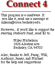 A emailware Connect 4 game for the Macintosh or Power Macintosh. Requires System 7, 256 color monitor recommended, but it is playable with any monitor.