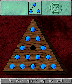 Genius is a Macintosh rendition of the popular game where you try to remove all the pegs from a triangular board by jumping pegs.