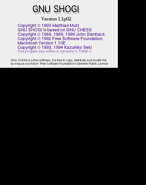 Please, find attached GNU Shogi 1.1E for the Macintosh (based on UNIX version 1.1 patch level 02).
