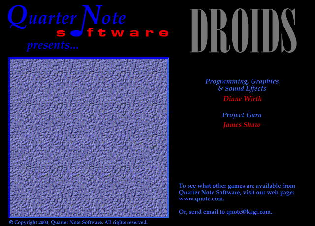 Droids is an updated and supercharged strategy game based on the classic Mac game of Daleks. As you battle your way through the many and varied levels, the androids get smarter and smarter and more technologically advanced. You'll have to come up with ever more clever and ingenious ways to "retire" them. Along the way, you'll get some help from other members of the Jayhawk Clan, but it is ultimately up to you to become the Savior of Terra! Droids requires: System 7.0 or greater; at least a 68020 Mac; 256 colors or greys; a 640 x 480 display; Sound Manager 3.0; 5 Meg of RAM; and 1.5 Meg of hard disk. Droids is shareware and costs $15.
