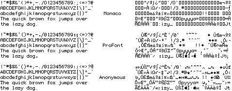 Anonymous is a nonproportional or monospaced 9 point bitmap font designed for programming, and for distinguishing between characters that can easily be confused in the Macintosh reserved ROM font Monaco 9. For example, in the Monaco 9 bitmap, an uppercase O looks like a zero, and a lowercase L looks like an uppercase i. Anonymous has a beautiful overall color when set into text, and is easy to read in long stretches. The font's name begins with A for easy access in font menus.