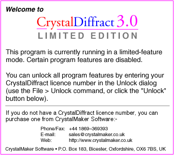 Title: CrystalDiffract 3.0.0 LE (x-ray/neutron powder diffraction software) Filename: crystal-diffract-300.hqx For folder: math-sci Keywords: science, crystallography, chemistry, geology, physics, crystal structures Requires: PowerPC processor, 6MB RAM, System 7.0 or later