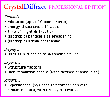 o Calculate powder diffraction patterns for any crystal o Simulate x-ray or neutron diffraction o Visualize diffraction in "film" for "graph" mode o Measure and index a diffraction profile o Interactively edit structural and other data - in real time! o Export detailed diffraction information