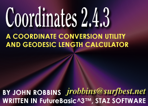 Additionally, Coordinates will also compute long geodesic lines on the ellipsoid. Given a starting latitude and longitude, a distance and a direction, Coordinates will compute the location of the end point. Also, it will compute the geodesic length and directions between two points of known latitude and longitude.