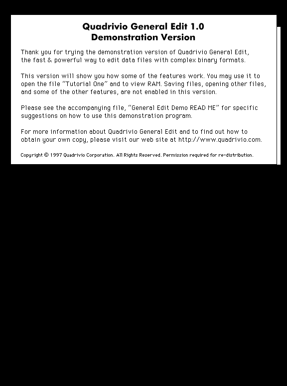 This package contains a demonstration version of Quadrivio General Edit 1.0, a powerful editing tool for data files with complex binary formats. Requires PowerPC. Commercial product, see for more details.