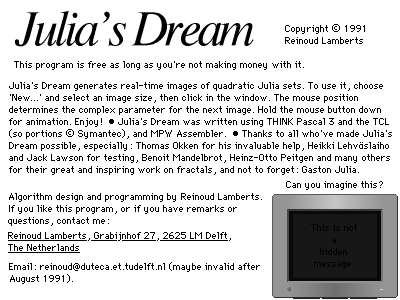 Juliasdream is a science or math tool. This download is a self-extracting StuffIt archive file (56 KB). Archived from the funet-legacy collection and preserved here for historical interest.