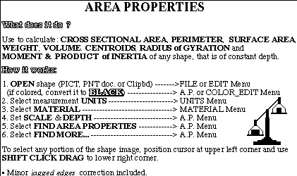 This is a application that will calculate section properties (area, moment & product of inertia, centroids, perimeter and volume ) of ant shape saved in a Pict or Bitmap file or from clipboard. This is classified as education, science, engineering.
