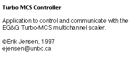 TurboMCS Controller is an application to interface with the Perkin Elmer (nee EG&G) TurboMCS Controller, a multichannel scaler hardware unit. The TurboMCS Controller software uses a serial connection between a Mac and the TurboMCS hardware to set various parameters and to control the data acquisition. The TurboMCS Controller software allows full access to the hardware features and can download the data quickly over the serial connection.