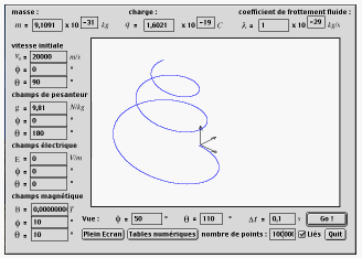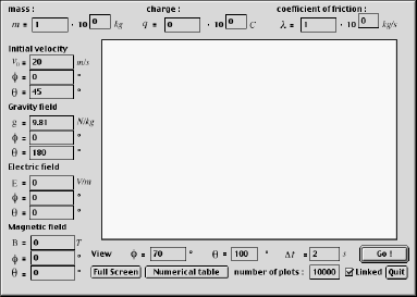 Trajecmulator is a 3D simulator of particle movement : give the mass of the particle, its charge the coefficient of fluid friction, the initial velocity, the gravity, electrical and magnetic fields ans the angles of wiew to see the trajectory of the particle. You can also generate lists of numerical data...