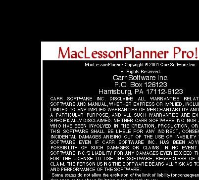 MacLessonPlanner Pro! 1.0 is a program for creating and editing lesson plans. It is a stand-alone program written for educators who yearn for an easier method of planning daily, weekly, and yearly lesson plans. The strength of MacLessonPlanner Pro! 1.0 is in handling unpleasant cycle day situations. Days of school missed during the week are properly passed over. The correct cycle days are kept in order. MacLessonPlanner Pro! 1.0 alleviates the mundane task of transcribing subjects and times of daily events from the current week's plans to next week's plans. The process of completing lesson plans is especially arduous for those using the cycle day system: snow days and holidays shift cycle days beyond what drawing arrows can help.