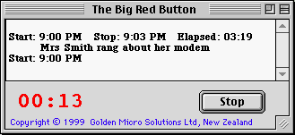 However, there are times, such as when the phone rings, or when someone walks into my office when the 'auto-pause' feature of TimeSlice is not what I need. In these cases I need some form of stopwatch to record the amount of time I spend in this unexpected activity-thus the Big Red Button was born.
