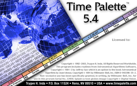 Time Palette provides extensive features for the international business traveler including: world time, alarms, international call scheduling, an extensive almanac, distance calculator and worldwide weather. An extendable database containing detailed time zone information for more than 10,000 cities is included. In addition, Time Palette displays multiple world maps demarcating the earth's sun and moon illumination in real-time.