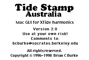 Tide Stamp is a tide and current predictor. Tide Stamp Australia calculates tides or currents for over 390 locations on or near Australia. Tide Stamp will run on any Mac with System 7 or later. Version 2.0 fixes all known bugs in 2.0b and is valid thru 2000.