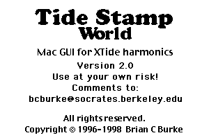 Tide Stamp is a tide and current predictor. Tide Stamp World calculates tides or currents for 880 locations world wide not including North America locations. Tide Stamp will run on any Mac with System 7 or later. Version 2.0 fixes all known bugs in 2.0b and is valid thru 2000.