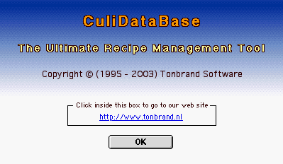 What it is: Recipe management tool for food lovers Author: Ton Brand Company: Tonbrand Software License: Shareware USD 8.00 Mac OS: 7.5.3 or later (PPC version works under Classic mode of Mac OS X) Abstract: CuliDataBase is an application for managing culinary recipes. A simple click with the mouse lets you put ingredients on a shopping list. Recipes can be scaled up or down according to number of servings, while the singular or plural form of the ingredients' names is taken care of as well, so '1 bay leaf ' will become '2 bay leaves' or vice versa. This works in English, French and Dutch. To illustrate your recipes, you can import pictures of dishes. Finally, you've got a list with culinary terms that you can extend yourself, and an Internet menu that you can modify to go to your favorite sites. The program offers 3 color skins and the option to hide the desktop. An unregistered copy of CuliDataBase is fully functional, apart from the export and print functions. There are PPC and 68K versions; with this you have the PPC version. Version 5.9.2 (PPC) fixes a minor bug and works now better in the Classic mode of Jaguar.