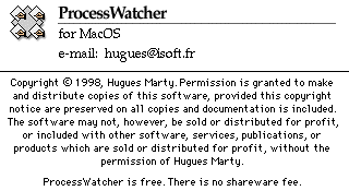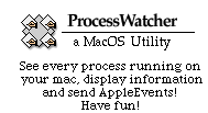ProcessWatcher is freeware. Requirements: Mac 68K or Power Mac PPC, System 7 or better. ProcessWatcher takes 290K in memory and 133K on disk.