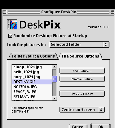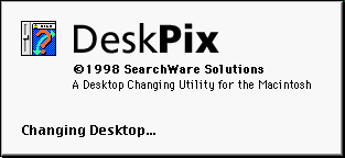 DeskPix 1.1 is a desktop picture randomizer for MacOS 8.5. Tell DeskPix which pictures you want it to choose from, by one of several different selection methods, and it will randomly set a new desktop picture each time you restart your computer.