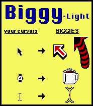BIG/LARGE, animated cursors for Mac. Replacements for pointer, wristwatch, I-bar, and cross. Doubles size of app-specific cursors. Thickens/heightens caret (blinking text insertion cursor in text fields). QuickPoint feature jumps cursor to default button in dialog boxes. Checked from System 7 to 8.5. ----------