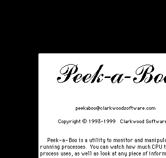 **** What is new in Peek-a-Boo 1.6 **** Peek-a-Boo has implemented an Apple Event interface to enable third-party programs to use Peek-a-Boo's Special Technology feature to set process priorities.