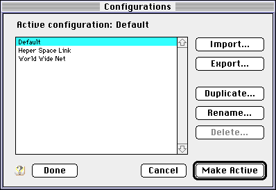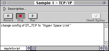 Sample scripts that exhibit each feature are included. A few of them are... - "Export All Configs" Executing this script exports all configurations currently available. - "Import Configs" You can drop any type of OpenTransport configuration files onto this script application. Dropped files will be imported by appropriate OpenTransport Control Panels.
