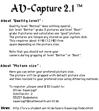 Photoshop AV-Capture2.1 is a Photoshop Plug-In designed to acquire still images via the AV/TV-Videocard or any other Quicktime compatible framegrappercard.