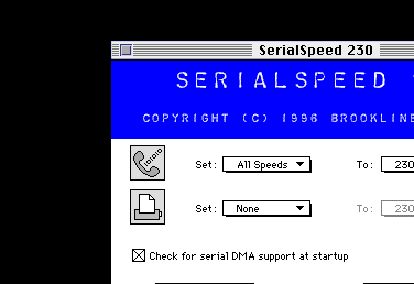 New in version 1.7: Bug fixes for better compatibility with OT/PPP and ARA. Works great with MacOS 8! SerialSpeed 230 is shareware; US $25.00 to register.