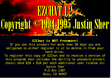 Shareware: If you use this program for more then 30 days you are obligated to send me $20 + $10 for each additional user license which you wish to register at your current facility. If you do this I'll even send you a copy of EZChat that will let you password protect your chats. One user license entitles you to run this program (to load it into memory and execute it) on no more then ONE computer at the same time.