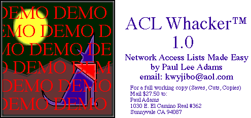 Reply to: RE>Re: ACL Whacker 1.0 Demo > ACL Whacker 1.0 Demo > > is a demo version of software that helps to manage Access Lists on AppleTalk > Internets. The submission includes the Demo version with Cut, Copy and Save > disabled, as well as a read me file to detail it's workings and history. It is > clearly labeled as DEMO software, both in the title and in the splash screen. > > > #000##021#ACLWhacker1.0Demo.sit#000##000##000##000##