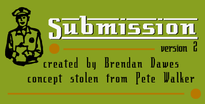 Please find attached a copy of 'Submission 2' an e-mail utility for Eudora. The application, written in Applescript with Facespan 3, allows you to compile and store mailing lists. The message, subject and from address can all be set from inside the Submission application. E-mail addresses can be imported from a text file or added from within the application. All queing and sending is done from within Submission.