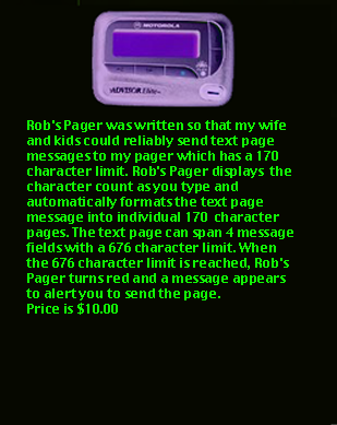 Rob's Pager was written so that my wife and kids could reliably send text page messages via e-mail to my pager which has a 170 character limit. Rob's Pager displays the character count as you type and automatically formats the text page message into individual 170 character pages. The text page can span 4 message fields with a 676 character limit. When the 676 character limit is reached, Rob's Pager turns red and a message appears to alert you to send the page. Shareware Price $10.00