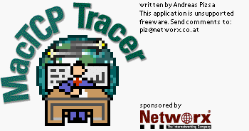 Please note: MacTCP tracer is a quick hack that I did in my spare time (just a few hours of work). Although I tested it for almost two days on my machine (Quadra 840av running System 7.5 and MacTCP 2.0.6) and didn't notice crashes caused by it, I can not guarantee that MacTCP Tracer will also work on your machine. Please see "Disclaimer" and "Warranty" below. Don't blame me*