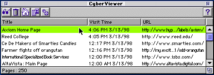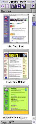 CyberViewer is an extension for Netscape Navigator that keeps a visual history of visited web pages. It displays a floating palette of visited pages, either as thumbnails or a text list. Unlike Netscape's history, entries don't disappear when Navigator is quit, aren't removed by going "back" or closing a browser window, and can be saved for a specified number of days, so the user can easily go back and find the address of a visited page.