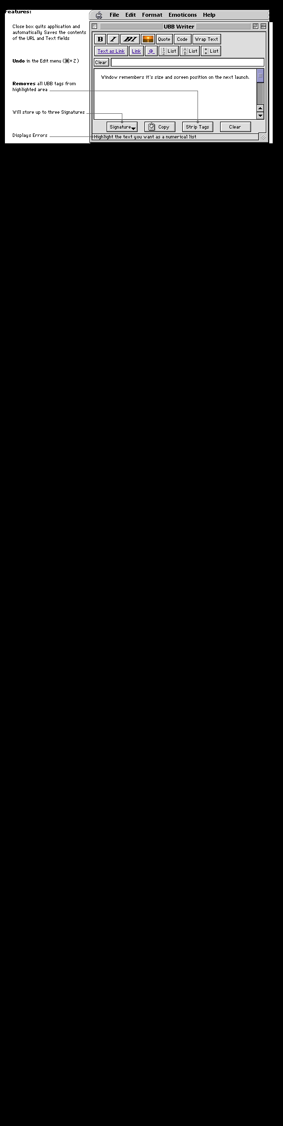 UBB Writer 2.0 (freeware) is an Ultimate Bulletin Board code editor that allows the user to add function and style to posts at forums like MacAddict, MacFixIt and MacNN. It is designed to allow users who have no experience with UBB code to take advantage of all the features of UBB code with the click of a button. For experienced UBB code writers, UBB Writer makes enhancing your posts simpler, quicker and more fun.