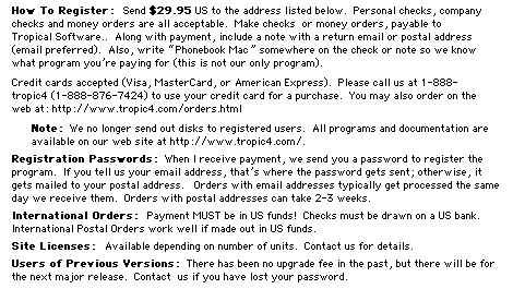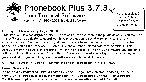 Product Description: Phonebook is a full featured contact management program for Mac OS. Among its features are: * Full contact database with address fields, name and or company designation, multiple phone numbers, and free form notes fields. * Multiple phone books * Small footprint is very handy for PowerBooks, iBooks, and other small screens. * Contacts may be segregated using color coded categories, and selectively displayed * Print envelopes or various phone books. * Phone number dialing
