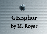 GEEphor is a Kaleidoscope 2.0+ scheme to match the style and colors of the fantastic new PowerMac G4 computer. -Martha Royer See and download my Kaleidoscope schemes here: http://www.kaleidoscope.net/schemes/completelisting.shtml Click the letter "R" and find my schemes there