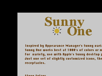 Sunny One for Kaleidoscope 2.1.x is a yellow and grayscale scheme inspired by the Sunny variation of Apple's Platinum interface for OS 8.5. It needs 1000 colors or more to look right. Sunny One features rounded windows with a mix of sunny yellow and grayscale shading for variety and eye relief, and it combines classic "tried and true" elements with newer Kaleidoscope 2 styling. This version features a few minor fixes and enhancements. Freeware.